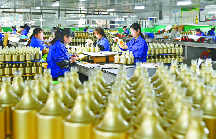 前锋工业园区的广安慧博玻璃工业有限公司员工在对玻璃瓶贴花。