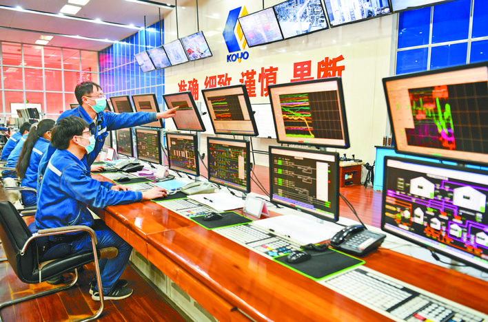 广安经济技术开发区新桥化工园区的广安玖源化工有限公司员工,在中央控制室通过电脑操作生产装置。